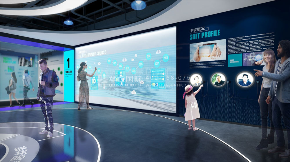 中軟國際企業展廳設計是由華竣國際執行整體設計施工的一項企業展廳案例,從“品牌、產品、文化、科技”四個方向,凸顯企業在行業內的領先地位,結合互動多媒體展示形式,打造人文合一的創新企業展廳案例,讓觀眾切身感受企業的品牌文化。